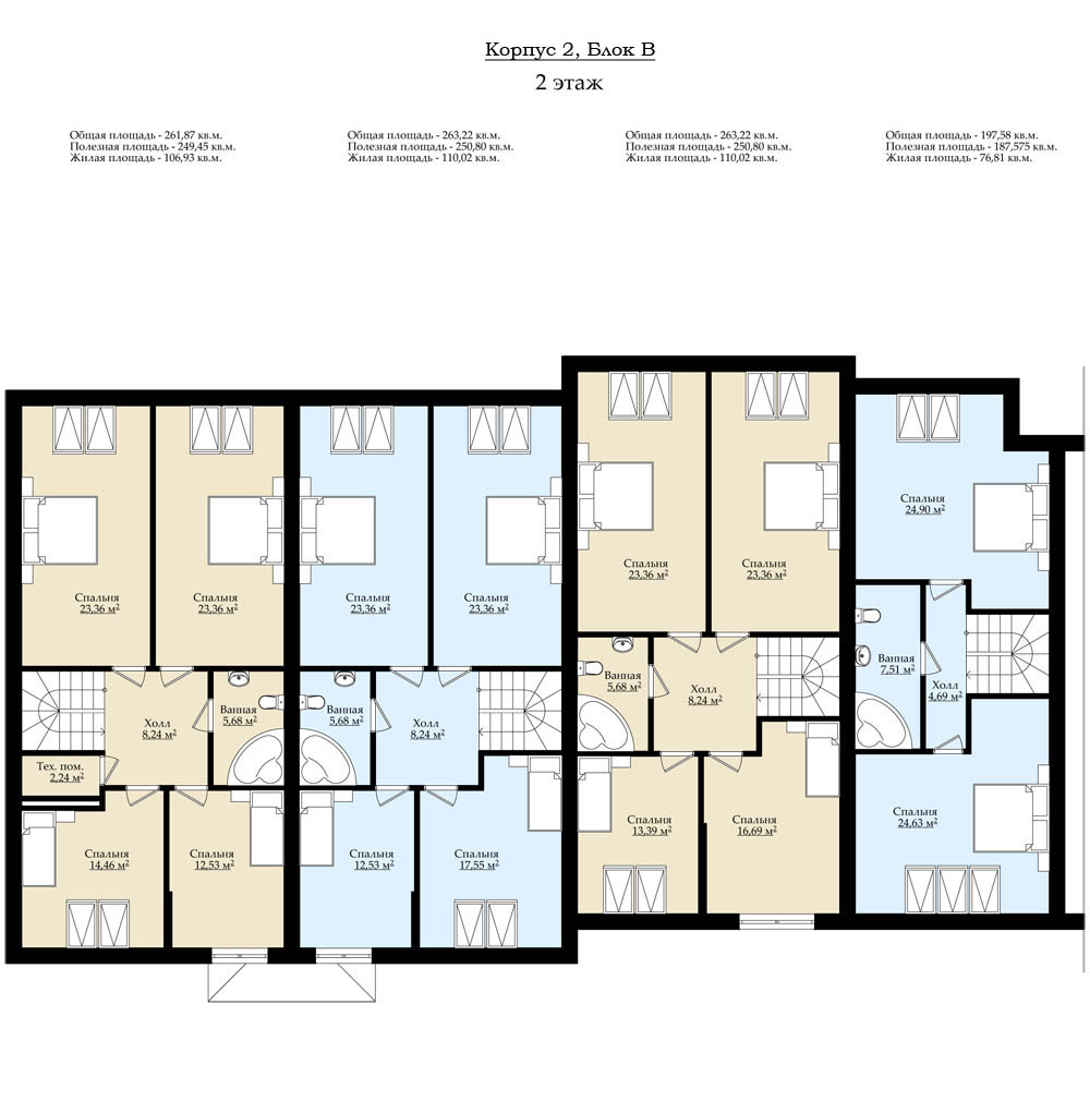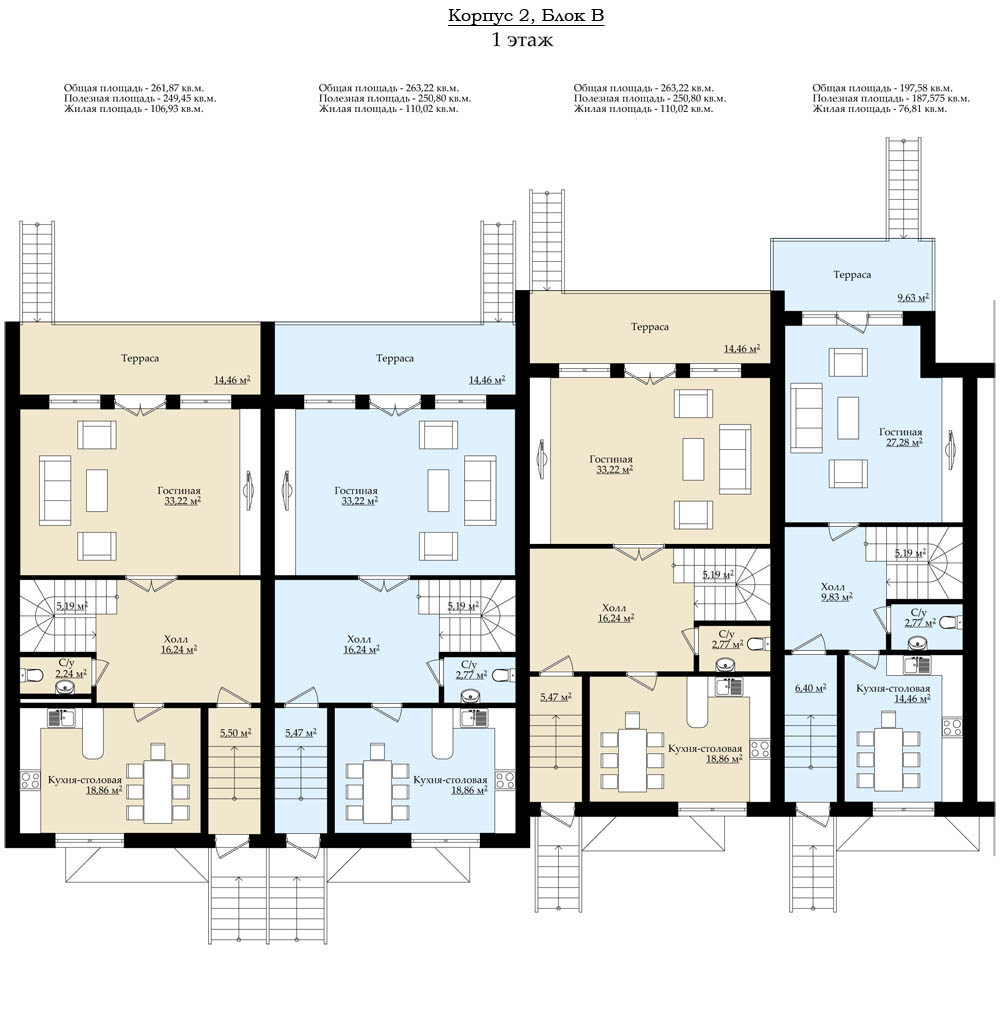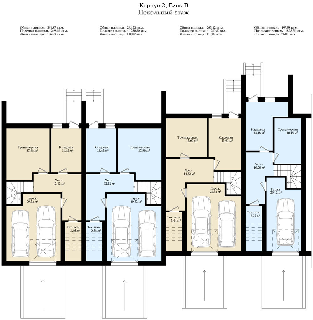 Состоит из четырех индивидуальных блоков, площадью от 200 до 263 кв.м. в трех уровнях.