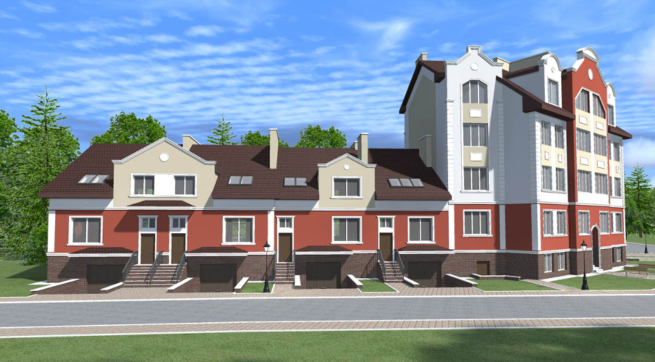 Состоит из четырех индивидуальных блоков, площадью от 200 до 263 кв.м. в трех уровнях.